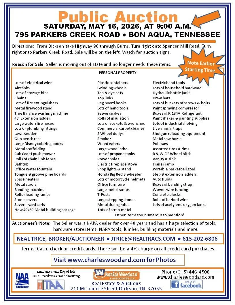 Tools, Hardware, Building Material & More! Saturday, May 16, 2026 9:00 AM 9:00 AM 09:00 09:00 795 Parkers Creek Road Bon Aqua, TN 37025 United States (map) Google Calendar ICS