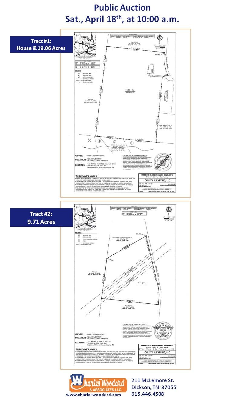 Home & 19.06 Acres & a 9.71 Acre Tract Saturday, April 18, 2026 10:00 AM 10:00 AM 10:00 10:00 1017 Dawson Road White Bluff, TN, 37187 United States (map) Google Calendar ICS